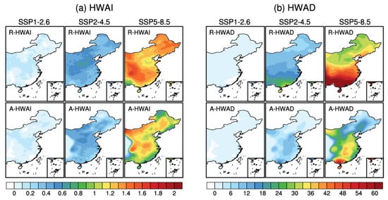 Spatial patterns of the differences between 2081–2100 and 2041–2060 for (a) HWAI (°C) and (b) HWAD (days).
