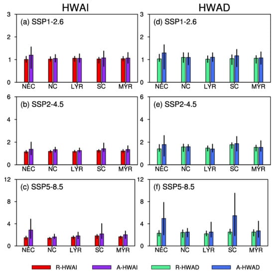 Ratios of heatwave indicators for 2081–2100 to those for 2041–2060 under SSP1-2.6 (a,d), SSP2-4.5 (b,e) and SSP5-8.5 (c,f). Red, purple, green and blue bars represent R-HWAI, A-HWAI, R-HWAD and A-HWAD, respectively. The perpendicular black lines at the top of the bars represent the variation between the 10th and 90th percentiles of the multi-model ensemble.