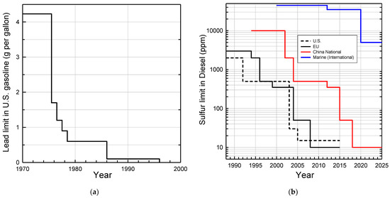 Reductions in regulatory limits for: (a) lead added to U.S. gasoline; (b) sulfur in diesel in the U.S., EU, China, and in marine fuel. The U.S. voluntary standard for lead from 1958 to 1975 was 4 cm3 tetra-ethyl lead per gallon which equates to 4.23 g Pb per gallon. The industry average use was approximately 2.4 g Pb per gallon in the 1950s and 1960s. The EPA required the availability of one grade of unleaded gasoline by 1974 to protect catalytic converters introduced in 1975. Limits from 1975 to 1986 were specified based on “pool averaging” allowing refiners to average over all grades of gasoline, including unleaded. In 1986 pool averaging was discontinued and the limit referred to leaded gasoline. The addition of lead to U.S. gasoline for road vehicles was banned in 1996 (https://www.epa.gov/history/epa-history-lead, accessed on 31 January 2022). Sulfur data were taken from https://www.transportpolicy.net/topic/fuels/, accessed on 31 January 2022.