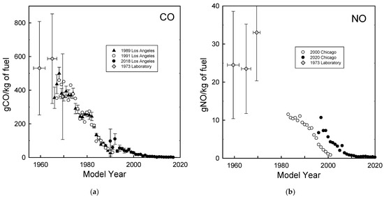 The University of Denver has conducted on-road optical remote sensing measurements of vehicle emissions over 30 years in Los Angeles [29] and over 20 years in Chicago [30]. The remote sensing technique measures the ratios of CO, HC, NO, SO2, NH3, and NO2 to CO2 in the exhaust plumes of individual vehicles as they pass by the monitoring equipment. A video camera captures the vehicle license plate information which can be used to determine the model year of the vehicle. The exhaust concentration ratios are converted into fuel-based emission factors (g pollutant emitted per kg fuel combusted) in the motor vehicle exhaust. Figure 2 shows CO and NO emissions as a function of the vehicle model year measured in Los Angeles in 1989, 1991, and 2018 and in Chicago in 2000 and 2020. Data for 1957–1962, 1963–1967, and 1968–1971 model year cars representative of the U.S. on-road fleet obtained in a laboratory study using the Federal Test Procedure driving cycle conducted in 1973 [31] are also shown in Figure 2. The systematic difference between the filled and open symbols in Figure 2b reflects the deterioration of the emission performance over the life of the vehicles (e.g., MY 2000 vehicles were less than a year old in the 2000 study but were about 20 years old in the 2020 study). The data in Figure 2 show the dramatic progress made in reduction of tailpipe emissions over the past 60 years. Remote measurements can be used to identify high emitting vehicles in the fleet for inspection and maintenance.
