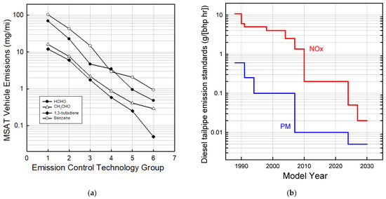 (a) Emissions of formaldehyde, acetaldehyde, 1,3-butadiene, and benzene from gasoline light-duty vehicles as increasingly sophisticated emission control technology was added over the vehicle model years 1970–2000. The technology groups are: (1) non-catalyst, (2) oxidation catalyst, (3) three-way catalysts, (4) transitional—low emission vehicles, (5) low emission (LEVs), and (6) ultra-low emission vehicles (ULEVs). (b) Evolution of emissions standards for NOx and PM for heavy-diesel vehicles (updated from [39]).
