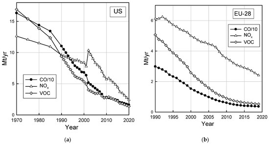 Total highway vehicle emissions in (a) the U.S. and (b) the EU-28, updated from Wallington et al. [45] see text for details.