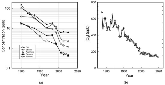 As the result of decreased emissions from mobile and stationary sources, the air quality in U.S. cities has improved substantially. Taking Los Angeles as an example, Figure 5a shows the decrease by a factor of approximately 10–100 in the concentrations of CO and volatile organic compounds and the decrease by a factor of approximately 5 in peak ozone levels (Figure 5b) over the past 50–60 years.