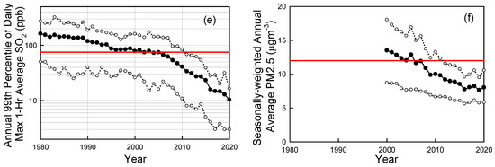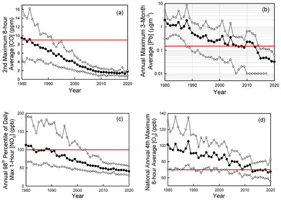 Trends in CO (a), lead (Pb) (b), NO2 (c), ozone (d), SO2 (e), and PM2.5 (f) in ambient urban air updated from Wallington et al. [45]. Solid symbols are averages, open symbols are 10th and 90th percentiles. The red horizontal lines are the primary National Ambient Air Quality Standards (NAAQS). Data were taken from the EPA Air Trends site [53] accessed in 2022 and 2019.