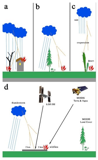 In this study, the lightning wildfires were recorded using several satellites. The usual scheme used to carry out investigations is shown in Figure 1d. The two MODIS sensors, established on Terra and Aqua satellites, and the LIS sensor, allocated on board the ISS spacecraft, have different temporal and spatial coverage. Thus, the next temporal–spatial criterion was chosen to register the fact that ignition is triggered by cloud–ground lightning strikes.