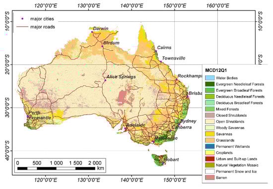 The definitions of the types of lightning wildfire, presented in Figure 1, require knowledge of Australian land cover. In this study, the International Geosphere-Biosphere Programme (IGBP) land mask classification schemes, which have 17 vegetation classes, were used. The original MCD12Q1 files from the C6 collection in HDF format are available from the Earth Explorer server (Earth Explorer) [41]. For more detailed information about the development and accuracy of the MCD12Q1 products, please see [42] and the references therein.