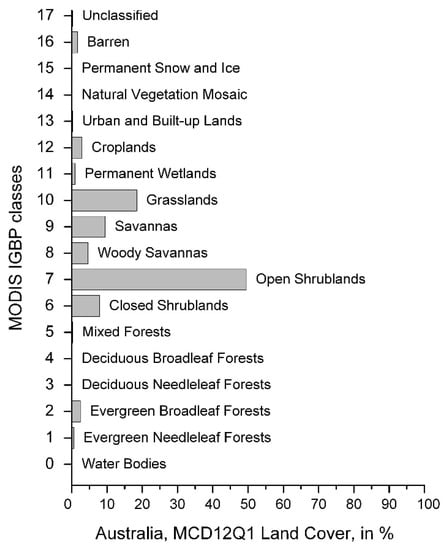 The contributions of different IGBP classes to Australia’s land cover (MCD12Q1, 2018) [44] are presented in Figure 3. According to the MODIS land cover map of Australia, the open and closed scrublands, grasslands, and woody and grass savannas were evaluated (please see Table S1 in Supplementary Materials).