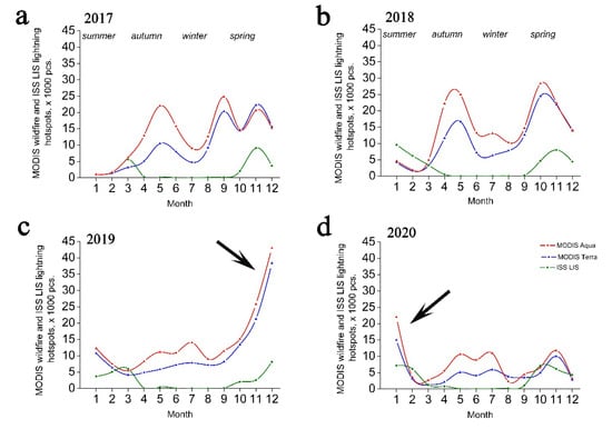 The comparison between monthly distributions of MODIS Terra (blue) and Aqua (red) wildfire hotspots, and the ISS LIS lightning flashes (green lines), for the 2017 (a), 2018 (b), 2019 (c); and 2020 (d). Abnormal numbers of wildfires in the spring and summer are marked by arrows.