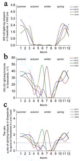 The monthly distributions of lightning hotspots (LIS ISS) recorded in grasslands, in pieces (pcs.), in percentages (%) of total monthly lightning hotspots, and the ratio of lightning attraction are drawn in (a–c), respectively. The months of 1–3 and 10–12 are involved in the Australian wet (thunderous) season, and 4–9 correspond to the dry season.
