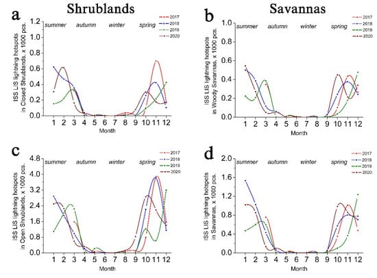 The monthly distributions of LISS ISS flashes, recorded in the open (c) and closed (a) shrublands, and in the woody (d) and grasslands savannas (b) in absolute values (pcs.) in the period 2017–2020. MODIS land cover (MCD12Q1) is used for estimations.