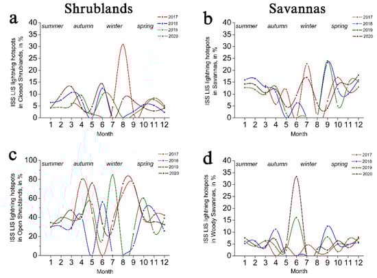 The monthly distributions of LISS ISS flashes, recorded in the open (c) and closed (a) shrublands, and in the woody (d) and grasslands savannas (b) as % of total monthly lightning flashes recorded in Australia in 2017–2020.