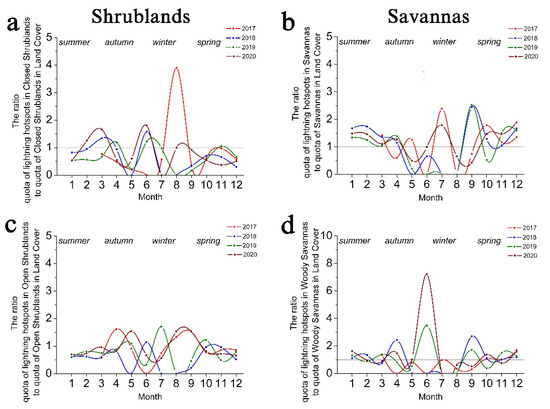 The monthly distributions of ratios of lightning attraction of open (c) and closed (a) shrublands, and of grasslands (b) and woody savannas (d), are presented.