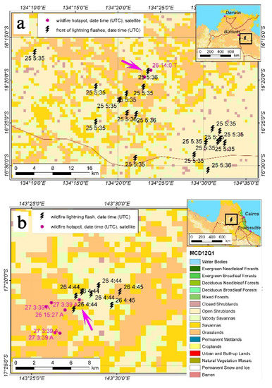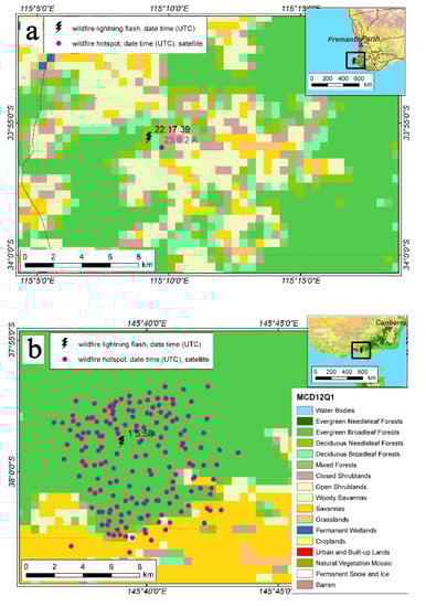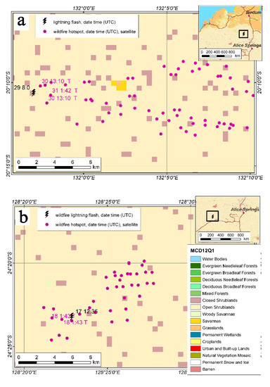 Two events of lightning wildfires in the area covered by open shrublands, with embedded closed shrubland pixels, are presented in Figure 10. The lightning wildfires in Figure 10a correspond to the event that took place on 29 October 2017, nearby Birdum, in the north of Australia. Another study case, which is drawn in Figure 10b, relates to ignitions nearby Alice Springs on 17 December 2017.