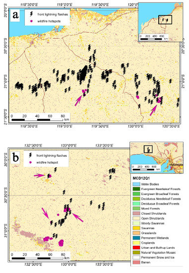 The spatial join distributions of a couple of the lightning flashes and the wildfire hotspots, recorded together by the ISS LIS (black zipper markers) and by the MODIS Terra/Aqua (red points) sensors in the northwestern part of Australia. (a) corresponds to the study case on 29 October 2017, and (b) on 17 December 2017. In both cases, the weather conditions promoted propagation of the wildfires to the east in the next one to two days. These lightning-caused wildfires have a place in open shrublands. The MODIS land cover map (MCD12Q1, 2018) was used as a background image.
