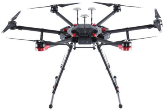 The hexacopter DJI MATRICE 600 PRO that is shown in Figure 1 was selected as the carrier of this platform due to the flight performance, payload capabilities, and robust control system. The DJI MATRICE 600 PRO is equipped with a dedicated DJITM A3 PRO (Guangdong, China) triple-modular redundancy system and advanced intelligent flight functions, ensuring safe and stable operation at all times. Its mechanical design with quick-release landing gears and mounted folding arms makes it easy to transport, store, and prepare for flight. According to the technical description, it has a maximum takeoff weight (including UAV) of 15.5 kg and uses six intelligent batteries to extend the flight time up to around 30 min without load or around 15 min with a 6 kg load.