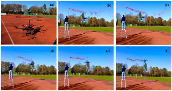 Investigation of the downwash flow caused by the propellers of the Hexacopter UAV (DJI M600 PRO) using a red colored smoke cartridge: (a) hexacopter UAV arrangement; (b) hexacopter UAV about 90 cm below the smoke plume; (c) hexacopter UAV about 70 cm below the smoke plume; (d) hexacopter UAV about 30 cm below the smoke plume; (e) hexacopter UAV about 30 cm below the smoke plume; and (f) hexacopter UAV at the same level of the smoke plume.