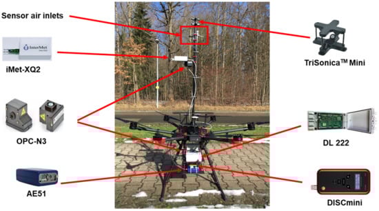 For measuring PM1, PM2.5, and PM10, a small and lightweight (105 g) optical particle counter (aerosol spectrometer) OPC-N3 from the company Alphasense was chosen. This low-cost PM sensor measures the particle number concentration with a measurement range of 0.35 until 40 μm distributed in 24 size classes. The OPC-N3 uses the light-scattering principle to measure particle size and particle number concentration. Particle mass loadings, PM1, PM2.5, and PM10, are then calculated from the particle size spectra and concentration data, assuming a particle density and refractive index (RI). Furthermore, the OPC-N3 uses a voltage-controlled fan to define the airflow through the measurement chamber in contrast to many other low-cost sensors that do not control the airflow at all [21]. The OPC-N3 requires a 4.8 to 5.2 Volt DC supply with minimal noise. Therefore, a data logger with an external Lipo Battery was added to the UAV platform for powering the OPC-N3 and acquiring data. In addition, the data logger combines the data from temperature and relative humidity sensors with the OPC’s data and provides a timestamp for the single file. The OPC-N3 costs around EUR 350, making it a reliable low-cost sensor based on its performance compared to other low-cost sensors.