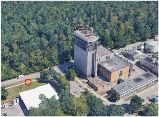 Google Earth image of the field test site showing the power plant of the University of Stuttgart-Vaihingen campus and the UAV take-off location (marked with the red circle).