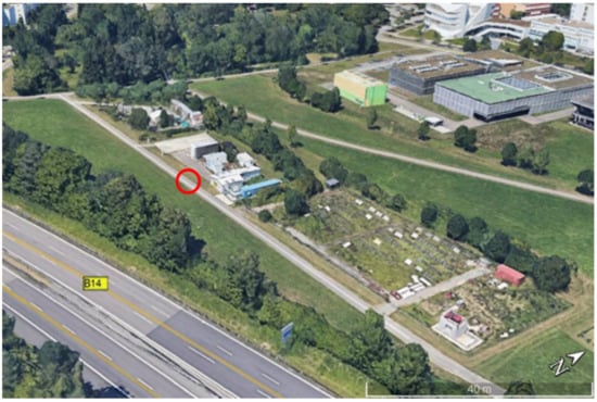 The field test was conducted next to the coal-fired power plant on the campus of the University of Stuttgart, in Stuttgart-Vaihingen (48.7506° N, 9.1103° E). As can be seen in Figure 4, the power plant is surrounded by university buildings and forest. The height of the power plant stacks located around 60 m AGL was used as a reference for the first experiments. The experiments for the case study were conducted in Am Lauchäcker next to the federal highway B14 with the purpose of studying the three-dimensional distribution of the traffic-related air pollutants and the influence of the meteorological parameters. Figure 5 shows the location of the measurement site (48°44′16.9″, N 9°05′51.0″ E). The take-off location, indicated with the red circle, was set up about 40 m north of the federal highway.