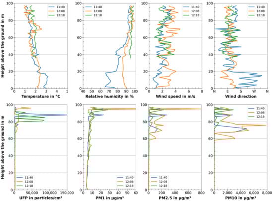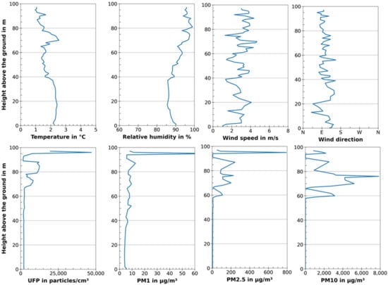 The vertical profiles presented in Figure 6 represent the average values per meter of the ascents carried out during the field test. The temperature profiles overall decreased with height and had larger variations below 40 m, especially during the earliest ascent. The relative humidity profiles, on the other hand, tended to increase with height but also showed greater variation below 40 m. The wind speed profiles showed fluctuations throughout the flights and the values were lower than 4 m/s. Regarding the wind direction profiles, the biggest variations were observed below 20 m. This might have been due to obstacles such as buildings and trees in the surroundings of the take-off location. Concerning the pollutants, the vertical profile of the ultrafine particles and the PM1 showed similar results; concentrations increased significantly above 80 m of height, while the PM2.5 and PM10 profiles showed concentration increases from lower heights. The BC measurement device was not used for this experiment.