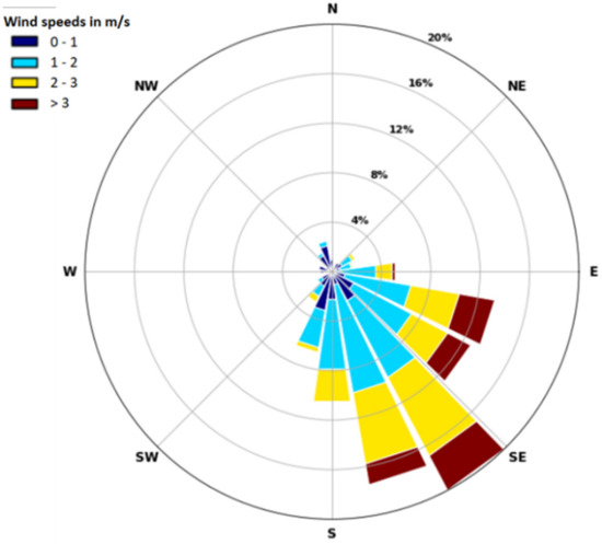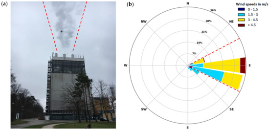 The power plant was in continuous operation during the field test, providing similar conditions for all three vertical flights. However, the emission plume had a particularly well-defined shape while performing the ascent at 12:08, and, as Figure 7a shows, it was moving towards the vertical path of the UAV platform. When comparing the picture from the flights with the corresponding wind rose during that ascent, shown in Figure 7b, it was confirmed that the data collected with the wind sensor agrees with the wind direction in the picture. The wind came predominantly from the east, with wind speed values mostly over 3 m/s, which might have favored the uniform transport of the emission plume.