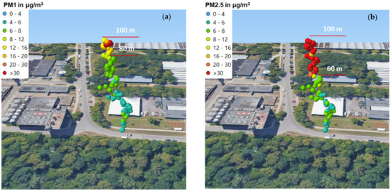 Three-dimensional visualization of the average concentrations of (a) PM1 and (b) PM2.5 during the three ascents performed in the field test on 23 January 2021.
