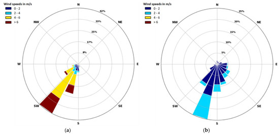 Wind rose graphs showing wind speed and wind direction measured with the TriSonica Mini for the time of the vertical flights made on (a) 16 January 2021 and (b) 19 January 2021.