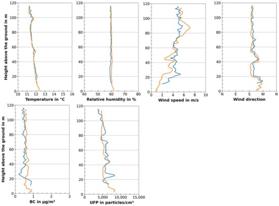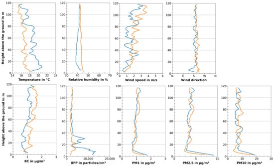 Figure 11 shows the vertical profiles of the meteorological parameters and air pollutants during the flight performed at 13:52 on 16 January 2021; the blue line represents the ascent and the orange line the descent. The temperature profile shows a uniform decrease with altitude and a total drop of 1 °C from the ground up to the height of 120 m. The relative humidity was nearly constant, at about 60%. The wind speed was relatively low up to a height of around 20 m and gradually increased with altitude, reaching values of up to 7 m/s. The wind direction was consistently from the south and the southwest. The BC and UFP concentrations slightly decreased with altitude and the average values for the complete flight were 0.6 μg/m3 or 600 ng/m3 and 5600 particles/cm3, respectively. Overall, there was a well-mixed atmosphere from the ground up to 120 m AGL, which can be attributed to the relatively high horizontal wind speeds with an average value of 4.6 m/s.