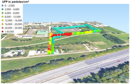 Three-dimensional visualization of the UFP concentrations measured with the DISCmini during the horizontal flight at 30 m AGL performed at 13:41 local time on 23 January 2021.
