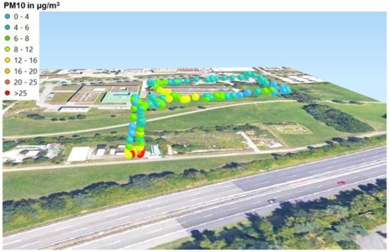 Three-dimensional visualization of the PM10 concentrations measured with the OPC-N3 during the horizontal flight at 30 m AGL performed at 13:41 on 23 January 2021.