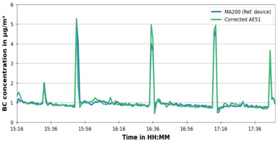 Comparison between the reference device data (MA200) and the corrected data (AE51).