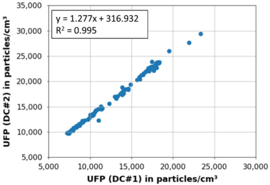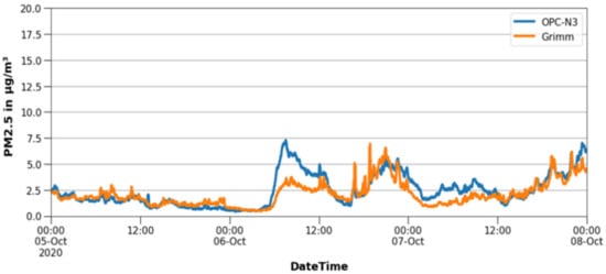 Quality assurance was obtained for all the portable sensors and devices by comparing them with reference instruments. The aethalometer AE51 used in this study was validated with its most recent version from the same company (AethLabs), the aethalometer MA200 (reference instrument). The comparison between the two devices was carried out in the laboratory for about 3 h, using a flow rate of 150 mL/min. After checking the average BC values in μg/m3 measured by the two aethalometers, a minor offset was found between the two devices. A simple linear regression was applied to correct the AE51 data according to the MA200 device. The comparison results for these two devices are shown in Figure 16. The curves from both devices correspond to each other and the results are comparable. The Diffusion Charger DISCmini (DC#1) used in this study was compared with another DISCmini (DC#2) from the same company (Testo). Figure 17 shows the comparison between the two devices. Since the DC#1 was newer and more recently calibrated by the manufacturing company, it was selected as the reference device to which the results of the second instrument were related. Since there was no significant deviation between the two devices, no corrections were applied to this data. The OPC-N3 used in the present study was compared with a Grimm model EDM 180. The parallel measurements were conducted over a period of three days at the air quality monitoring station located at Marienplatz in Stuttgart. Figure 18 shows the average PM2.5 min values measured by the two instruments. Both graphs showed a similar trend, but there were some small inconsistent gaps between them that may have been due to the susceptibility of OPC-N3 to relative humidity. Therefore, no correction was performed on the raw data obtained.