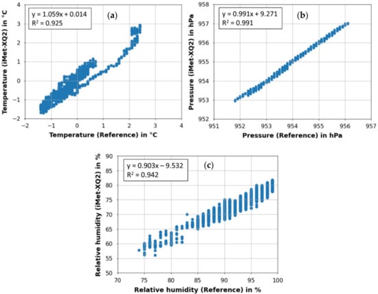 Comparison of (a) air temperature, (b) air pressure, and (c) relative humidity results (iMet-XQ2) with the reference device (GILL).