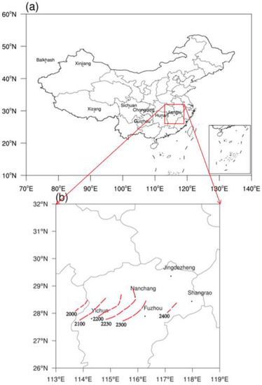A mesoscale convective system developed from scattered thunderstorms in Hunan Province (location is shown in Figure 1a, similarly hereinafter) around 1700 UTC on 15 April 2016. The storms moved eastward rapidly and gradually organized into a squall line in the western Jiangxi Province at 2000 UTC on 15 April. The squall line affected Jiangxi from 2000 UTC on 15 April to 0200 UTC on 16 April with short-term strong winds and short-duration heavy rains (Figure 1b, red dashed line represents the approximate position of the squall line at the corresponding time, determined by the position of the strongest radar composite reflectivity, which was obtained from the radar base data of the nearest 6 min). Based on observations at the regional automatic meteorological stations of China, eight stations showed short-term strong winds of more than 24.5 m·s−1, and the largest of up to 33.8 m·s−1. A total of 27 cities and counties experienced short-time heavy rainfall (≥20 mm in 1 h), and the heaviest was up to 46.2 mm in 1 h.