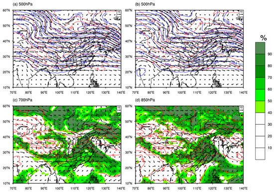 500 hPa geopotential height (blue solid lines, units: dagpm) and wind field (vectors, units: m·s−1) and temperature (red solid lines, units: °C) at 1200 UTC (a) and at 1800 UTC, (b) and wind field (vectors, units: m·s−1), temperature (red solid lines, units: °C) and relative humidity (shaded, units: %) at 700 hPa (c) and 850 hPa (d) at 1800 UTC on 15 April 2016.