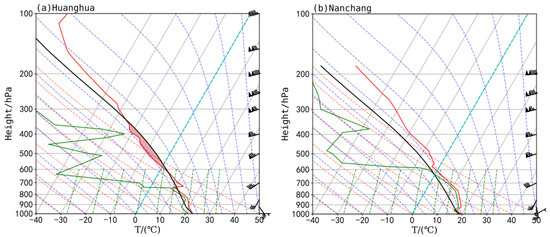 T-lnP chart at Huanghua (a) and Nanchang (b) radiosonde station at 1200 UTC on 15 April 2016 (the green line represents dewpoint profile, the black line represents the lifting curve, the red line represents temperature profile).