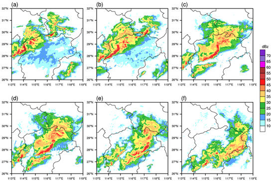 Evolution of radar composite reflectivity (shaded, units: dBz) at 2000 UTC, (a) 100 UTC, (b) 2230 UTC, (c) 2300 UTC, (d) 15 April 2016 and 0000 UTC, (e) 0100 UTC, (f) 16 April 2016.