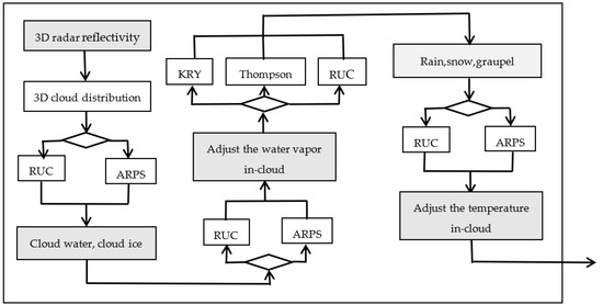 We used the cloud analysis method [6,30] within the GSI Assimilation System to assimilate radar reflectivity. The detailed process is shown in Figure 5. The ARPS [31] or RUC [32] scheme can be used to calculate the mixing ratios of cloud water and ice. The KRY [33], Lin [34] or Thompson [35] scheme can retrieve the mixing ratios of snow, rain, and graupel using radar reflectivity. The ARPS scheme (assuming that the vertical change of the temperature in-cloud is a wet adiabatic process) or RUC scheme (assuming that the vertical change of the temperature inside the cloud is a non-adiabatic process) can adjust the temperature in-cloud. The ARPS scheme or RUC scheme can adjust the water vapor in-cloud. Through sensitivity experiments, the following combination of different schemes can produce the best simulation for this squall line: the RUC scheme was used to calculate the mixing ratios of cloud water and ice, the Thompson scheme was selected to calculate the mixing ratios of snow, rain, and graupel, the ARPS scheme was used to adjust the in-cloud temperature, and the RUC scheme was chosen to adjust the in-cloud water vapor.