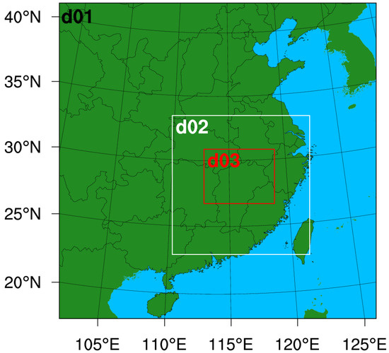 Three two-way interactive nested domains were set for the WRF (Version 3.9.1) [36] model (Figure 6). The domains have 50 vertical layers with the model top at 50 hPa, and 301 × 301, 391 × 397, 601 × 466 grid points from outer domain to inner domain with horizontal grid point spacing of 9, 3, 1 km, respectively. The model starts at 1800 UTC 15 April 2016 with the initial and boundary conditions provided by the WRF Preprocessing System (WPS) initialization module by interpolating the 6-hourly 1° × 1° NCEP reanalysis dataset to the model grid points. Firstly, radar radial velocity data were assimilated by the GSI-3DVar (Version 3.4) with the IVAP observation operator and radar reflectivity data were assimilated by the cloud analysis method at 1800 UTC 15 April without cycling process. And then sensitivity tests were conducted by forecasts with four different double-moment MP schemes from 1800 UTC to 2400 UTC 15 April with a time step of 30 s. Results were provided every 30 min. The simulation results of a 1 km domain are analyzed in this paper. Some key physical parameterization schemes include the rapid radiative transfer model (RRTM) [37] for longwave radiation, the Dudhia [38] for shortwave radiation, the Yonsei State University (YSU) scheme [39] for planetary boundary layer processes, the Noah land surface scheme [40], the revised Monin-Obukhov mixed-layer scheme [41], and the Kain-Fritsch cumulus scheme [42] for the 9 km domain (no cumulus parameterization scheme was used for 3 and 1 km domains).
