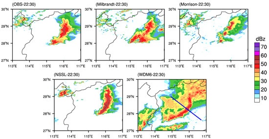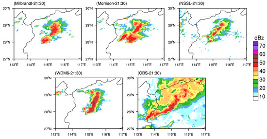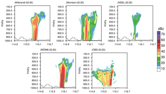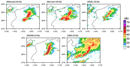 In this paper, high resolution radar reflectivity observation data were used to verify the simulation results. The simulated and observed radar composite reflectivity at 2130 UTC, 2200 UTC, 2230 UTC 15 April 2016 are depicted in Figure 7, Figure 8 and Figure 9. It can be seen that the process of the straight squall line evolving into a bow-shaped squall line with the WDM6 scheme is similar to the observations, especially the strong convective line. However, the location and intensity of the strong convective area are slightly different from the observations, and the simulated stratiform area is too small. On the contrary, the simulated radar composite reflectivity with the Morrison, Milbrandt and NSSL schemes are different from the observations. Although the squall line with the Milbrandt scheme also evolves into a bow-shaped squall line, the bow-shaped structure differs significantly from the observations, with a loose and small strong convection area, and no obvious stratiform area. The structure of the strong convective area with the Morrison scheme is looser than with the Milbrandt scheme, with a larger difference from the observations. The strong convective area simulated by NSSL is discontinuous, and the strong convective line does not evolve into a bow-shaped structure, but a broken northeast–southwest convective line, and moves eastward. Among the four double-moment MP schemes, only the WDM6 scheme simulates the evolution process of the straight squall line into a bow-shaped one well.