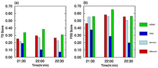 (a) Threat scores and (b) Fractions Skill scores of predicted reflectivity for the 40 dBz threshold value with four double-moment MP schemes from 2130 UTC to 2230 UTC 15 April 2016.