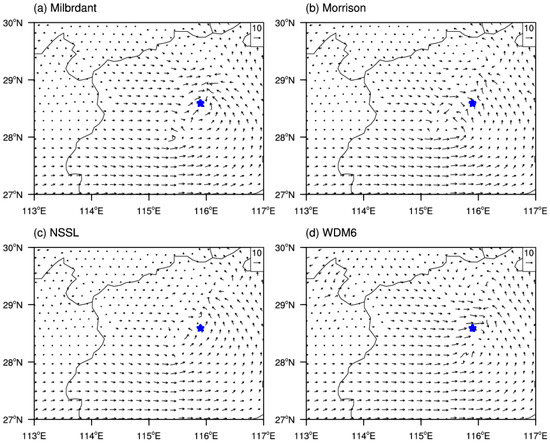The 700 hPa storm-relative wind fields at 2230 UTC 15 April 2016 simulated by four double−moment MP schemes (vector, units: m·s−1). The filled blue star is the location of the Nanchang radar station. The square box in the upper-right corner shows 10 m·s−1 wind.