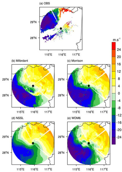 In order to directly reveal the influence of different double-moment MP schemes on wind fields, Figure 13 gives the observed and simulated radar radial velocity at the elevation of 0.5° of the Nanchang radar. The observed radial velocity has a large negative velocity region to the north-west, and the largest radar radial velocity is up to −24 m·s−1, indicating a rear inflow jet. With the WDM6 scheme, there is also one large negative velocity region to the west and south-west, slightly different from the observations, but the largest radar radial velocity is also up to −24 m·s−1. With the other three schemes, there is also one large negative velocity region to the west and south-west, but their intensities are weaker compared with the observations, especially regarding the NSSL scheme. Therefore, the WDM6 scheme generates the strongest rear inflow jet among the four schemes, and the strength of simulated rear inflow matches the observation well.