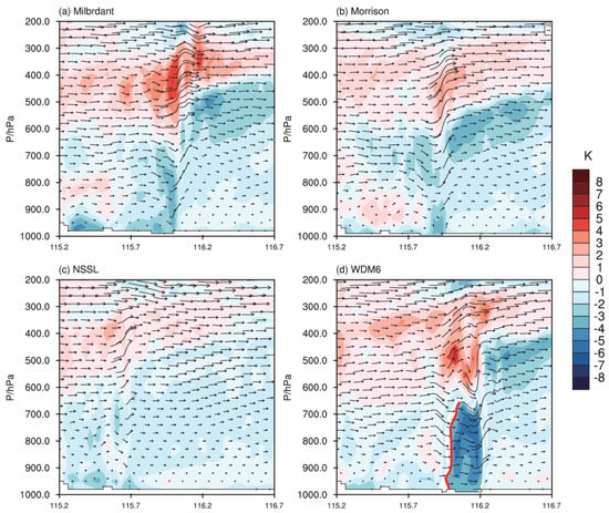 The vertical cross-section of zonally averaged (10 isometric profiles over 28° N–29° N) wind vectors [vector, (u, 10 w), units: m·s−1] and perturbation potential temperature (shaded, unit: K) at 2230 UTC 15 April 2016 with four different double-moment MP schemes. The red thick line in Figure 14d is the cold pool boundary. The square box in the upper−right corner in (b) shows 10 m·s−1 wind.