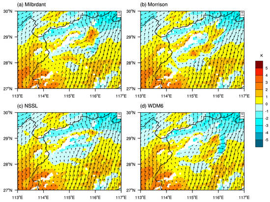 The cold pool plays an important role in the formation of a bow-shaped squall line [49]. In this paper, the perturbation potential temperature (the potential temperature at each grid point minus the average in the simulated region) at 925 hPa is used to diagnose the cold pool. Figure 15 shows the perturbation potential temperature and wind fields at 925 hPa with the four different double-moment MP schemes at 2230 UTC 15 April 2016. For the Milbrandt scheme (Figure 15a), the strong convective area corresponds to low disturbance potential temperature, and the cold pool is accompanied by cold pool outflows perpendicular to the strong convection line. However, the range of the cold pool is small and its intensity is weak, and the cold pool outflows are also weak. The lowest perturbation potential temperature is only −2 K. There is only a small range of cold pool using the Morrison scheme, but no cold pool outflows perpendicular to the strong convective line (Figure 15b), which may be one reason that the structure of the simulated bow-shaped squall line is very loose. The NSSL scheme (Figure 15c) does not generate an obvious cold pool or cold pool outflows, which can be one reason that the simulated squall line does not evolve into a bow-shaped squall line. The cold pool simulated by the WDM6 scheme (Figure 15d) is relatively obvious. The strong convective area corresponds to low perturbation potential temperature with the lowest value under −4 K, and, moreover, strong cold pool outflows exist, which all contribute to the simulated squall line evolving into a bow-shaped squall line.