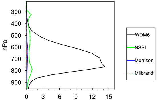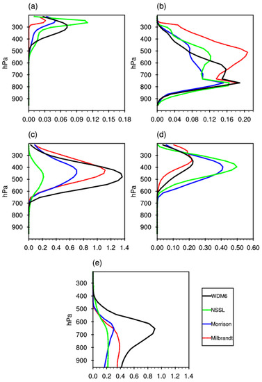 To further explore possible reasons why the evolution and structure of the simulated squall lines are different with the four double-moment MP schemes, we present the vertical profiles of domain-averaged hydrometeor mixing ratio simulated by each scheme at 2230 UTC 15 April 2016 in strong convective areas (Figure 16 and Figure 17). We define the strong convective area based on previous study [50,51,52,53,54].