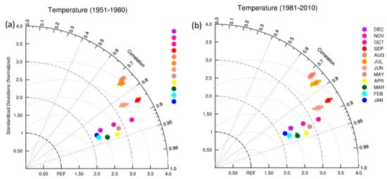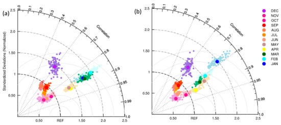 It should be noted that the values on the horizontal and vertical axis represent the normalized standard deviation which is calculated by taking the ratio of standard deviation in model to the standard deviation in the observation. Therefore, REF = 1 meaning the standard deviations in model and that in the observation are equal, implying RMSE = 0. It should also be noted that there are two sets of circular curves in the figure. One type of circular curves has the center where horizontal and vertical axes are meeting. This represents the position of the normalized standard deviation. Another type of circular curves has center at “REF”. This represents the position of the RSME in the model. Finally, the values at the circumference in the figure represents the pattern correlation. So the statistical representations close to “REF” in the Taylor diagram will be best fit. A detailed explanation about the Taylor diagram is described in [45]. We find that the AGCM simulations capture the precipitation climatology reasonably well for all months except December and January (Figure 2a,b). For the months June–November in both climate periods, the standard deviation is found below 1 mm/day with correlation coefficient above 0.6. This indicates the AGCM model is good at representing magnitude and pattern of precipitation during June through November. The standard deviation for December shows 1.5 mm/d with correlation 0.6 while the standard deviations of months January–May show in the range of 1–2 mm/day with correlation more than 0.7. During these periods, precipitation pattern in the model simulation is enhanced a bit due to higher correlation, but with relatively lower accuracy in the magnitude.