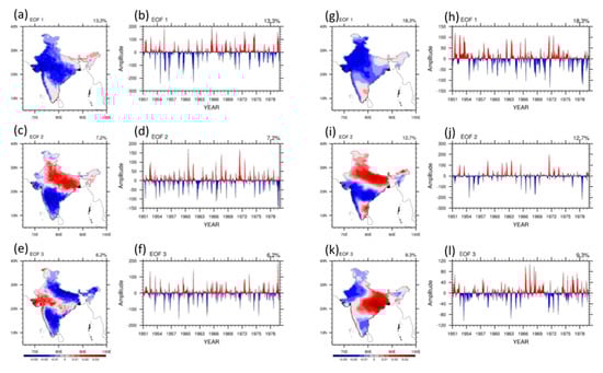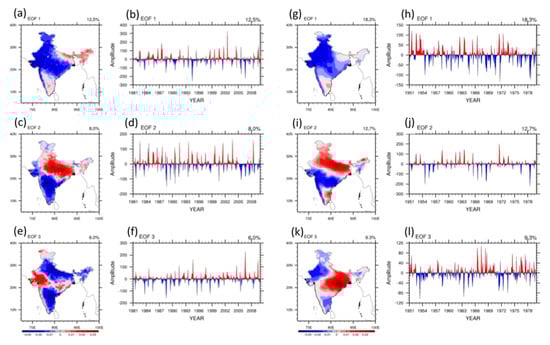 First three EOFs and their corresponding PCs of the temperature for the period 1981–2010 from (a–f) AGCM ensemble and (g–l) IMD observation.