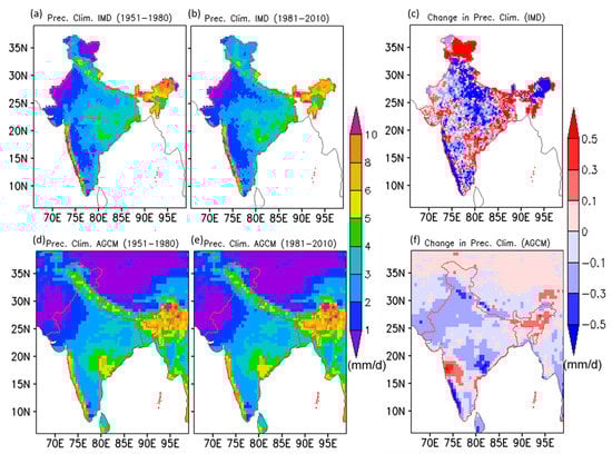 Precipitation climatology in two climate periods from (a,b) AGCM ensemble and (d,e) IMD observation. Change in precipitation climatology from (c) IMD and (f) AGCM.