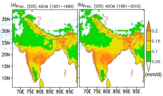 Western Ghats and northeast regions receive relatively more precipitation of about or higher than 6 mm/day, while western regions of India receive comparatively less precipitation of about or less than 2 mm/day. Some areas over Northeastern regions in addition to the Western Ghats region receive the highest amount of precipitation (>8 mm/day). AGCM ensembles also show the same patterns of precipitation over those regions of India, but with slightly higher amount (1 mm/d or higher) over those regions during the two climate periods (Figure 6d,e). On the other hand, the standard deviation of each individual ensemble climatology in two climate periods shows about 0–0.25 mm/day compared to their ensemble mean climatology (Figure 7). This indicates that the overestimated precipitation amount in the model simulated ensemble mean climatology is closer to the climate uncertainties seen from the standard deviation.